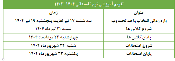 بر اساس ابلاغیه معاونت آموزشی وزارت علوم، تحقیقات و فناوری، به شماره 2/21/66271 مورخ 1404/03/13 مقرر گردید ارائه ترم تابستانی بصورت مجازی و آنلاین و برگزاری آزمون حضوری با شرایط ذیل صورت پذیرد.