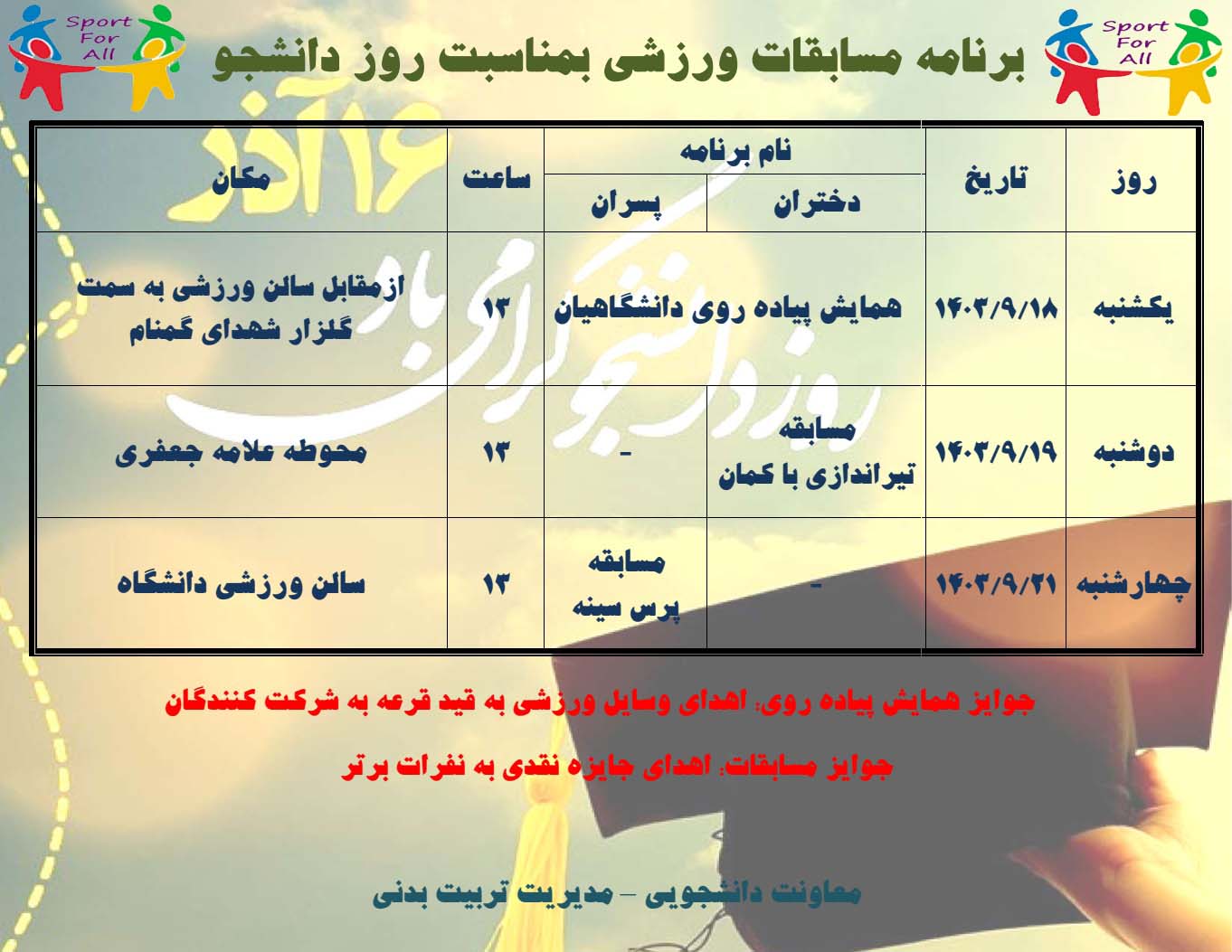 برنامه مسابقات ورزشی بمناسبت روز دانشجو ارسال به دیگران نام شما ایمیل شما ایمیل دریافتکننده ارسال انصراف