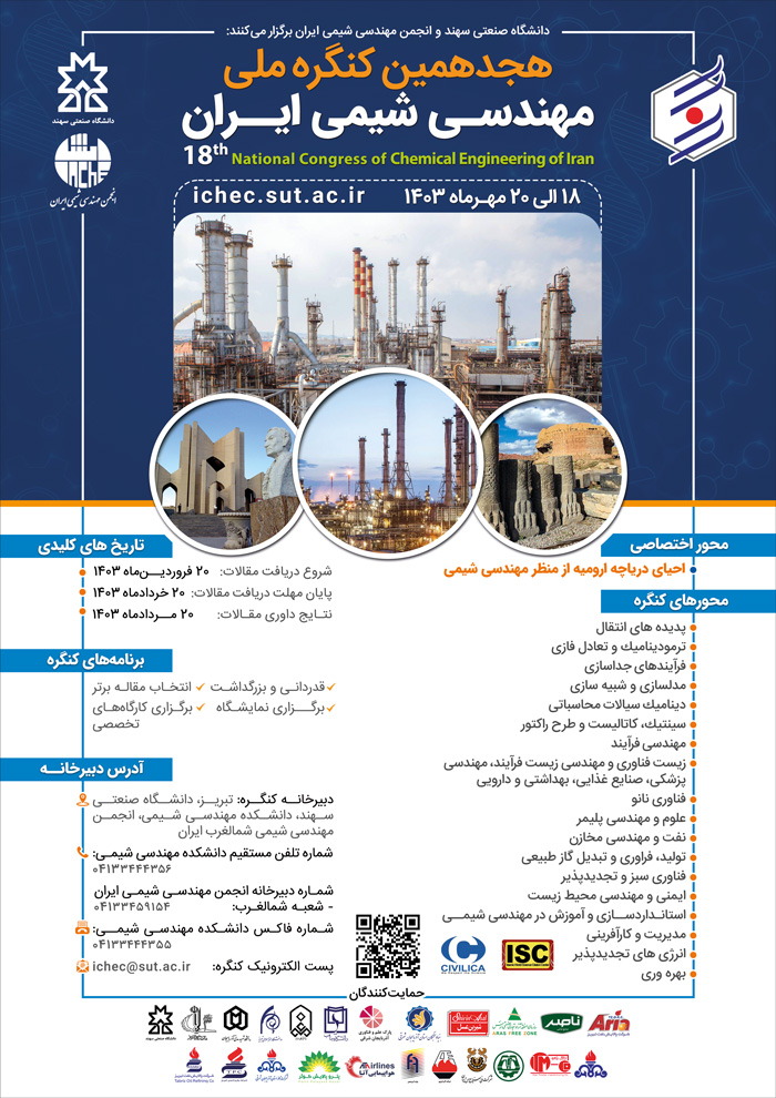 هجدهمین کنگره ملی مهندسی شیمی ایران با همکاری انجمن مهندسی شیمی در روزهای ۱۸ الی ۲۰ مهر ۱۴۰۳ در دانشکده مهندسی شیمی دانشگاه صنعتی سهند تبریز برگزار میشود.