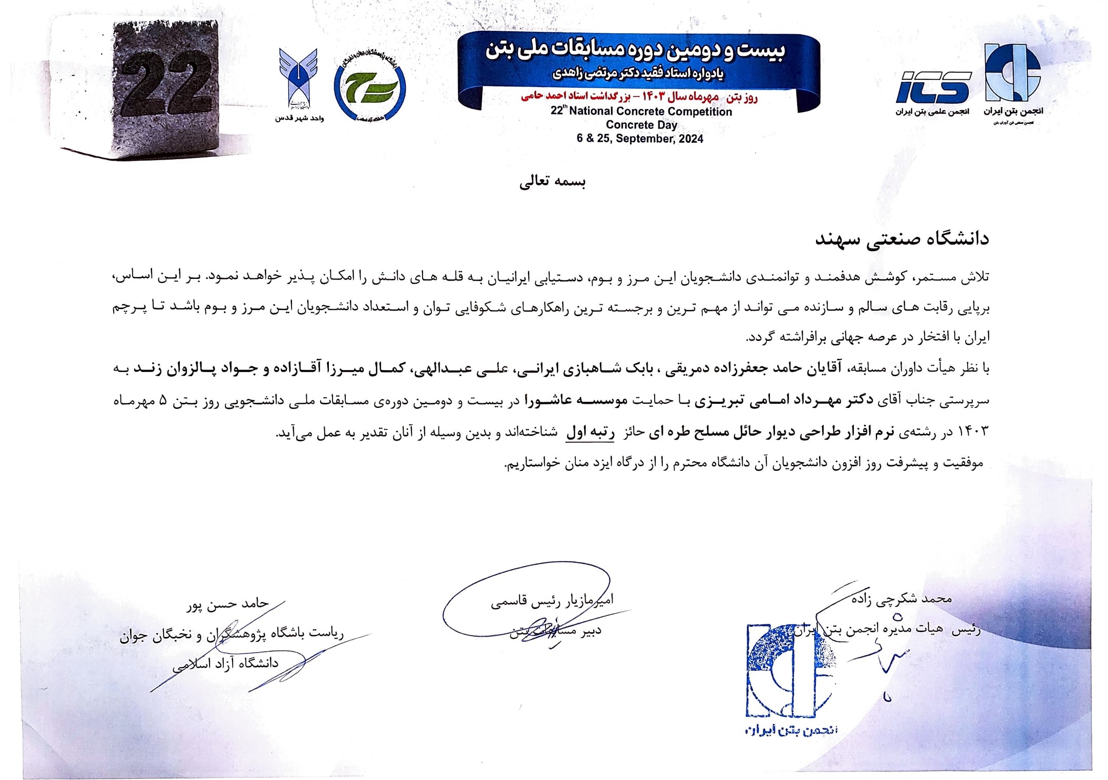 بدین وسیله به اطلاع می رساند که تیم دانشکده مهندسی عمران دانشگاه صنعتی سهند با حمایت موسسه عاشورا در بیست و دومین دوره مسابقات ملی دانشجویی روز بتن در مهرماه 1403 رتبه اول را در رشته نرم افزار طراحی دیوار حائل مسلح طره ای را کسب کرد.