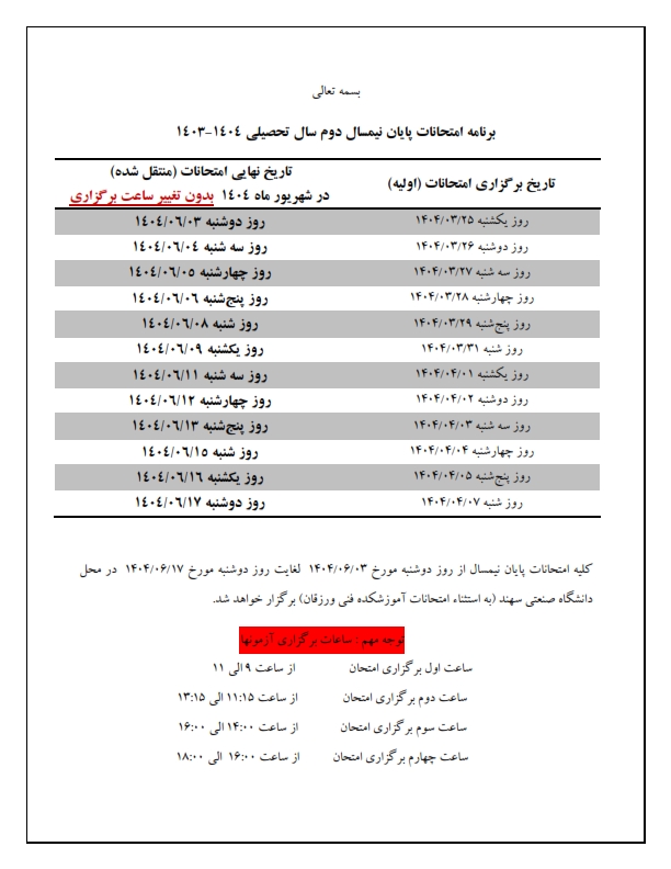 برگزاری امتحانات نیم سال دوم سال تحصیلی در شهریور ماه ۰۸ تیر ۱۴۰۴ | ۱۰:۴۷ کد : ۱۳۱۹ اخبار دانشگاه اخبار مهم ارسال به دیگران نام شما ایمیل شما ایمیل دریافتکننده ارسال انصراف تعداد بازدید:۱۳۷۳ به اطلاع دانشجویان محترم می رساند امتحانات پایان نیمسال دوم سال تحصیلی ۱۴۰۴-۱۴۰۳ مطابق برنامه پیوستی در شهریورماه سالجاری برگزار خواهد شد.
