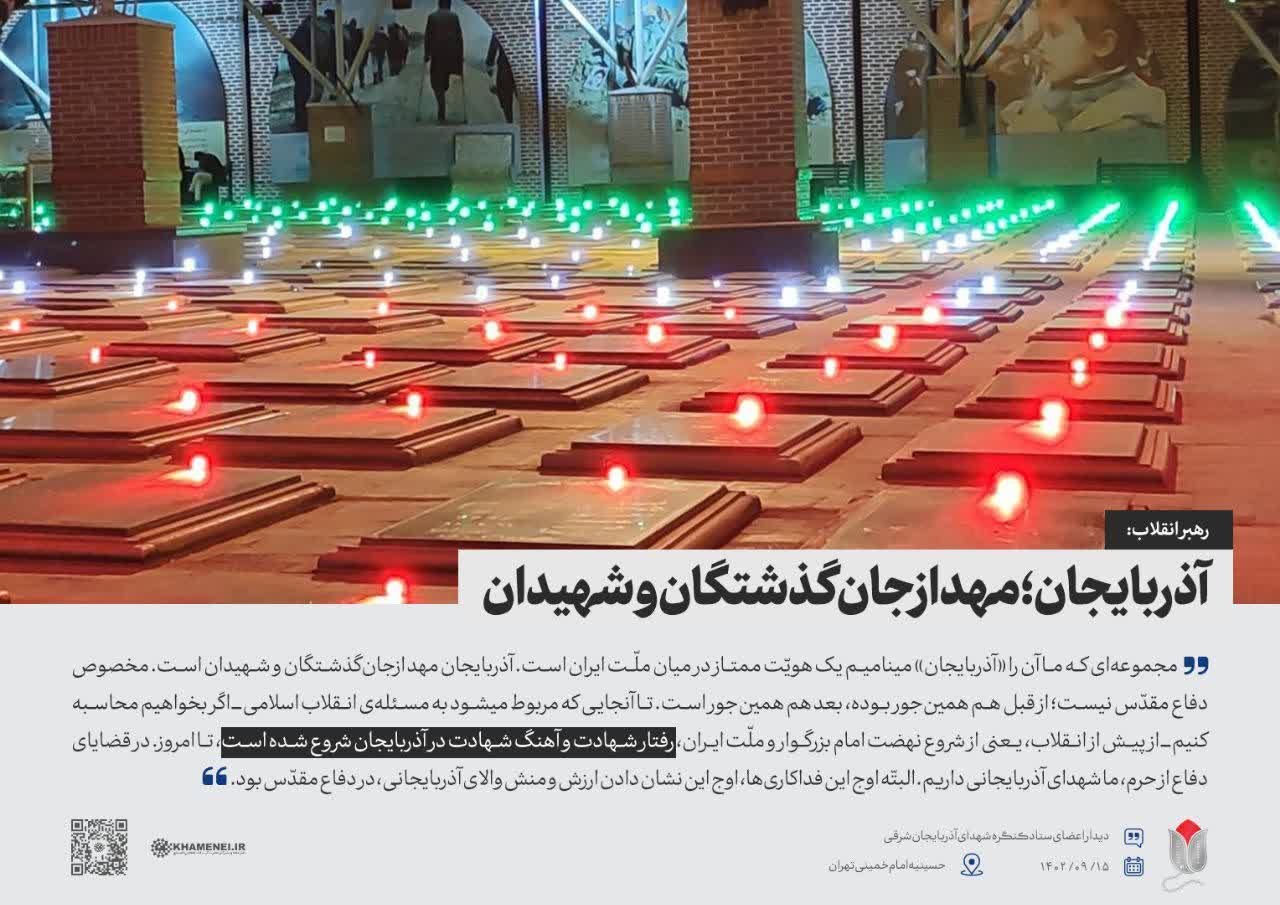 رهبر انقلاب: مجموعهای که ما آن را «آذربایجان» مینامیم یک هویّت ممتاز در میان ملّت ایران است. آذربایجان مهد ازجانگذشتگان و شهیدان است. مخصوص دفاع مقدّس نیست؛ از قبل هم همینجور بوده، بعد هم همینجور است. تا آنجایی که مربوط میشود به مسئلهی انقلاب اسلامی ــ اگر بخواهیم محاسبه کنیم ــ از پیش از انقلاب، یعنی از شروع نهضت امام بزرگوار و ملّت ایران، رفتار شهادت و آهنگ شهادت در آذربایجان شروع شده است، تا امروز.