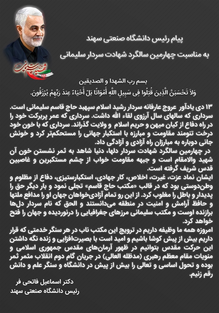 پیام رئیس دانشگاه صنعتی سهند به مناسبت چهارمین سالگرد شهادت سردار سلیمانی