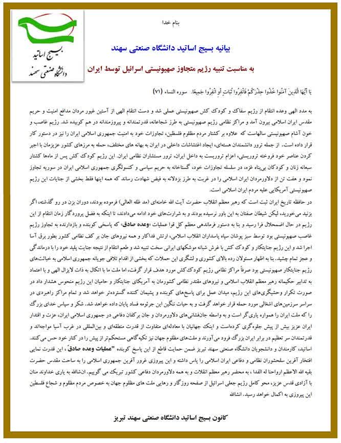 بیانیه بسیج اساتید دانشگاه صنعتی سهند به مناسبت تنبیه رژیم متجاوز صهیونیستی اسرائیل توسط ایران ۲۷ فروردین ۱۴۰۳ | ۱۰:۱۳ کد : ۵۰۱ اخبار مهم ارسال به دیگران نام شما ایمیل شما ایمیل دریافتکننده ارسال انصراف تعداد بازدید:۵۷۹