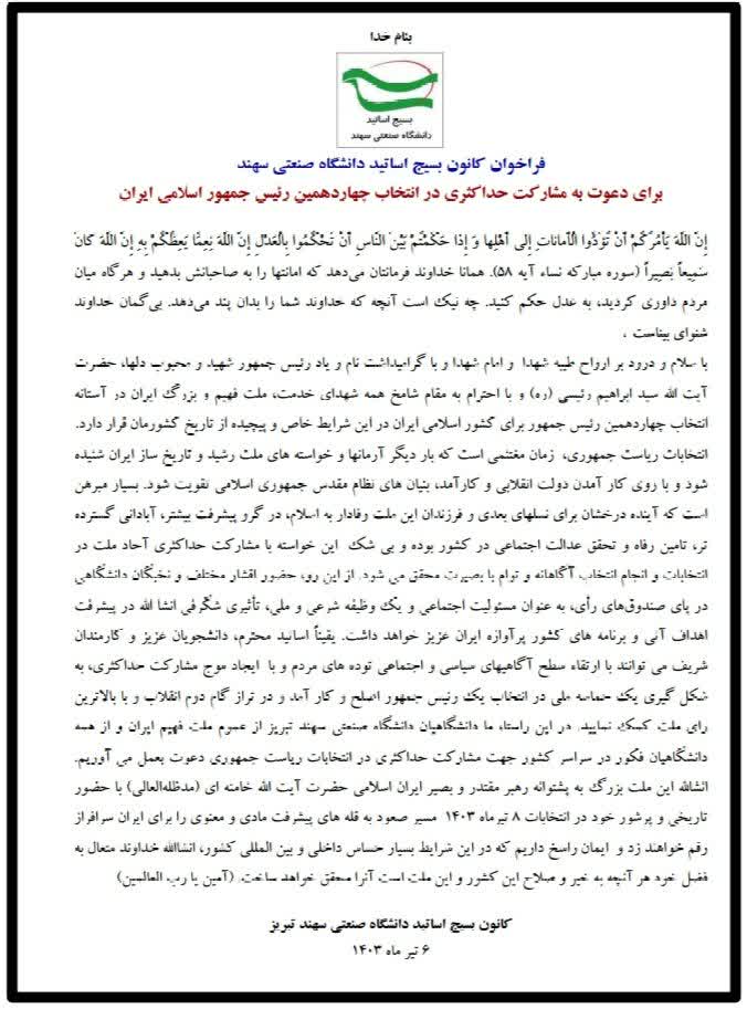 فراخوان کانون بسیج اساتید دانشگاه صنعتی سهند برای مشارکت حداکثری در انتخابات ۰۶ تیر ۱۴۰۳ | ۱۴:۳۶ کد : ۶۶۲ اخبار دانشگاه اخبار مهم ارسال به دیگران نام شما ایمیل شما ایمیل دریافتکننده ارسال انصراف تعداد بازدید:۴۹۷