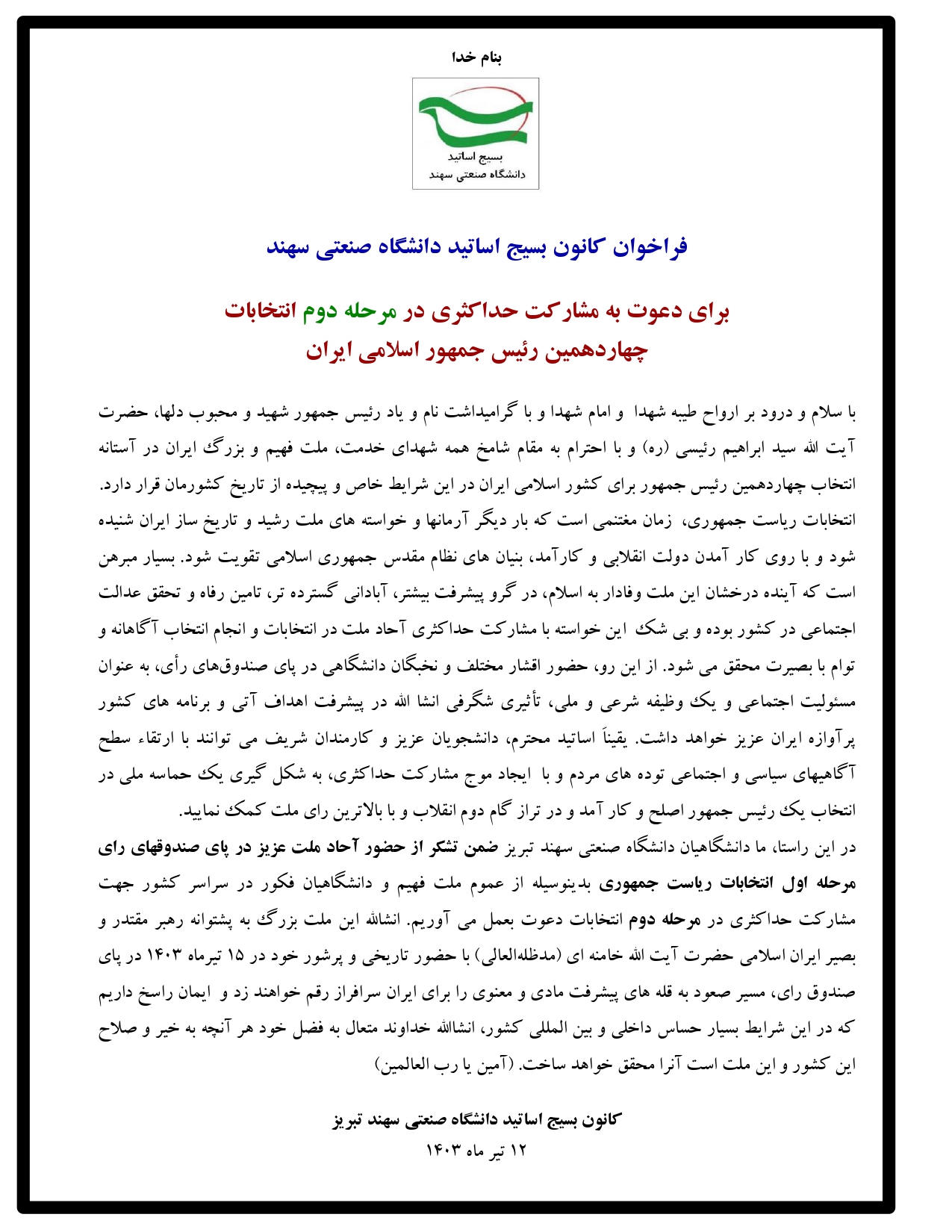 فراخوان کانون بسیج اساتید دانشگاه صنعتی سهند برای مشارکت حداکثری در دور دوم انتخابات ۱۲ تیر ۱۴۰۳ | ۱۴:۲۹ کد : ۶۷۸ اخبار دانشگاه اخبار مهم ارسال به دیگران نام شما ایمیل شما ایمیل دریافتکننده ارسال انصراف تعداد بازدید:۵۷۴