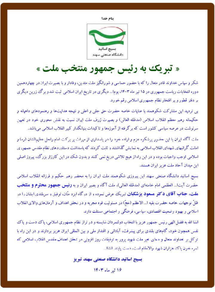 تبریک بسیج اساتید دانشگاه به رئیس جمهور منتخب ۲۰ تیر ۱۴۰۳ | ۱۳:۰۳ کد : ۶۹۲ اخبار دانشگاه اخبار مهم ارسال به دیگران نام شما ایمیل شما ایمیل دریافتکننده ارسال انصراف تعداد بازدید:۵۶۳