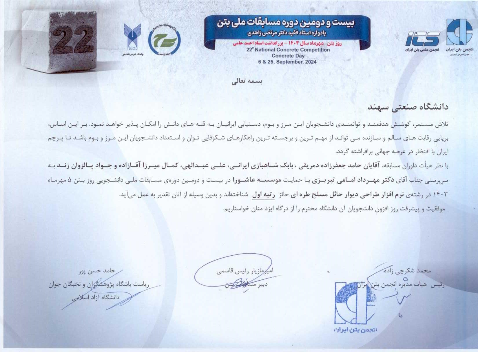 درخشش دانشجویان دانشگاه صنعتی سهند در بیست و دومین دوره مسابقه ملی بتن