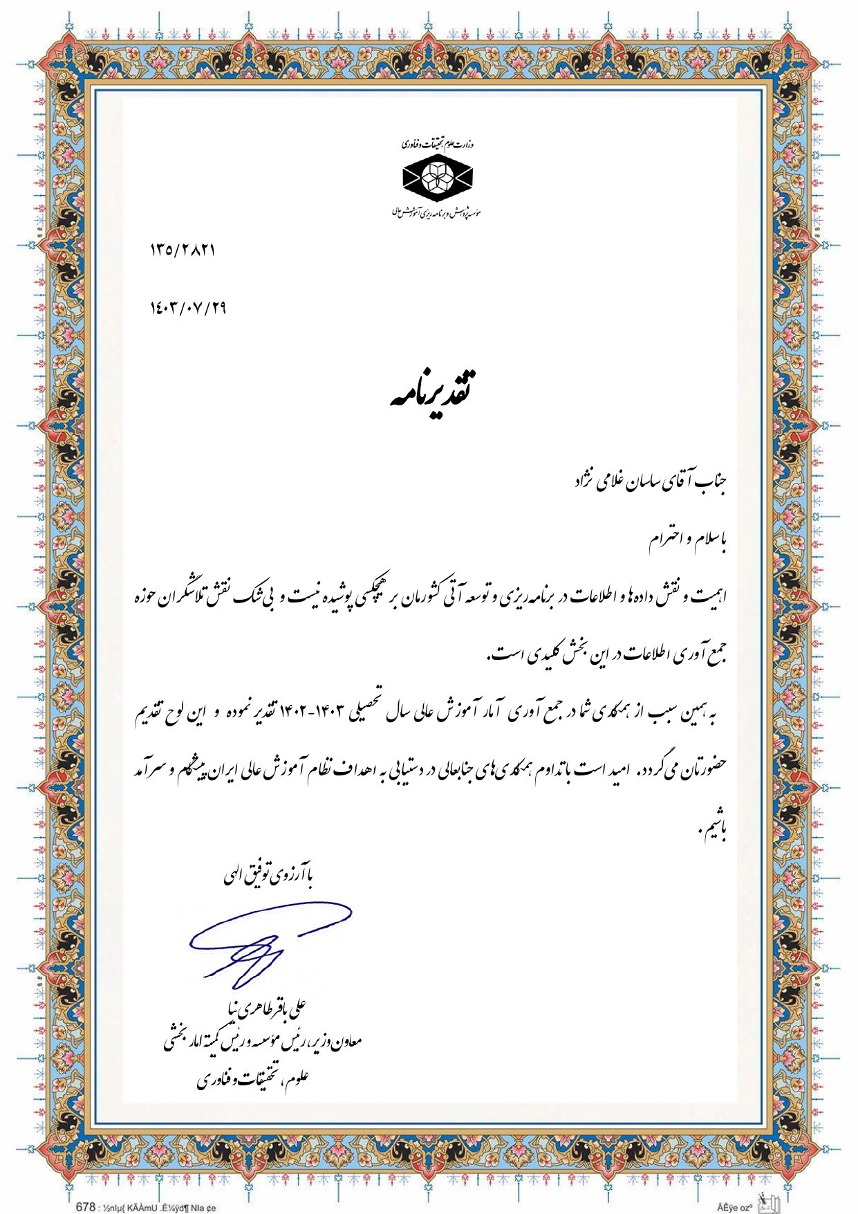 این تقدیرنامه به منظور قدردانی از فعالیتهای آقای غلامی نژاد در ارتقاء و بهبود دادهها و اطلاعات آماری در حوزه آموزش عالی به او اهدا گردید.