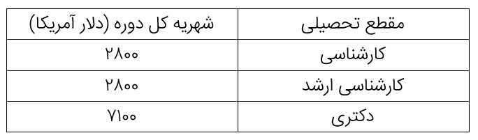 شهریه تحصیل دانشجویان بین المللی ارسال به دیگران نام شما ایمیل شما ایمیل دریافتکننده ارسال انصراف مطابق با آخرین مصوبه هیات امنای دانشگاه، شهریه تحصیل دانشجویان بین المللی در مقاطع مختلف به شرح زیر است: